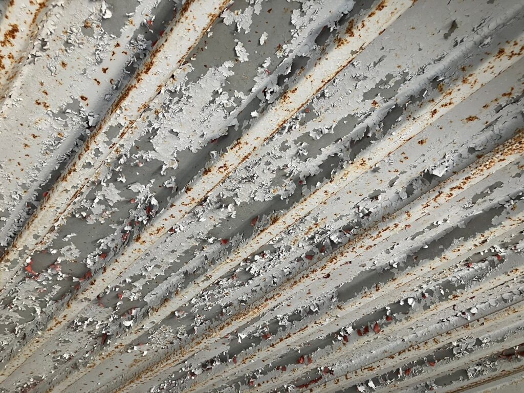また倉庫の軒天は、サビ汚れ・塗膜浮きが発生している状況でした。